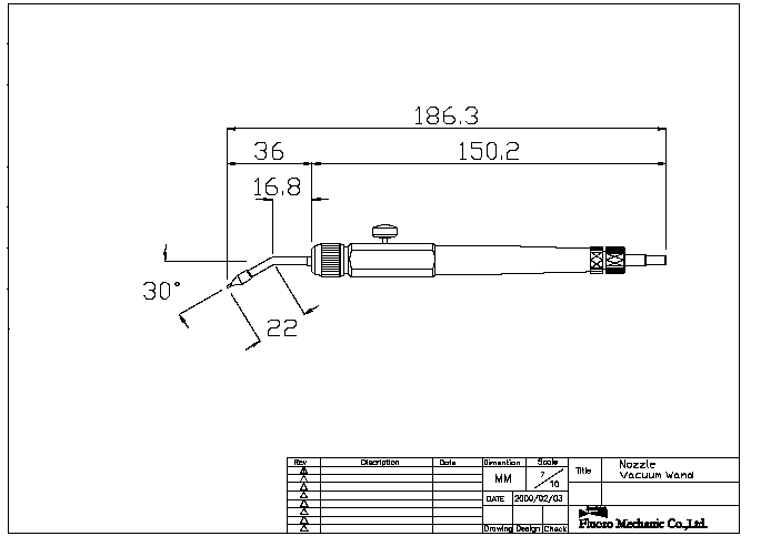 Vacuum wand without tip for handling small objects, including semiconductor dies, components, etc. Manufactured from ESD safe material. The valve is normally closed, so press the button to pick up. The vacuum tube connector allows push-on connection to any flexible tubing from 2.5 mm to 4 mm ID. ESD safe flexible tubing is available for use with this wand (part numbers 851-L, 851-M and 850-M). The tube connector has a quick connection feature that allows wands to be interchanged rapidly. Tip may be swivelled and rotated 30° in all directions and locked in position. Compatible with all nozzles, suction cups and slit tips (shown with typical nozzle). Fits stands 651 and 652.