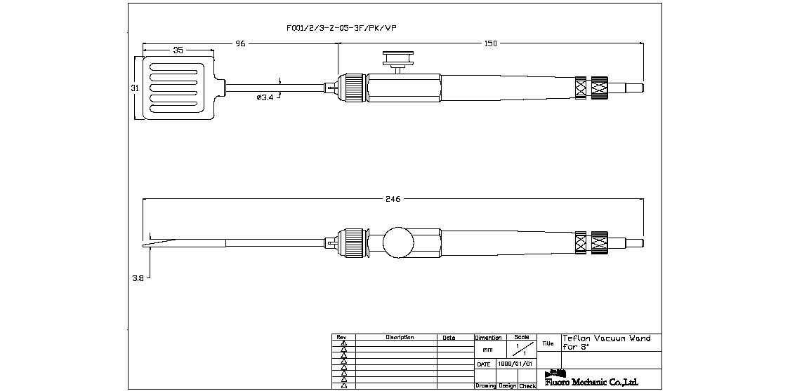 Complete vacuum wand including tip for wafer handling. PTFE body. Normally open push-button valve (press to release the wafer). Compatible with stand 658 or 659. The tip can be rotated and locked in position. Suitable for up to 8 inch (200 mm) wafers.