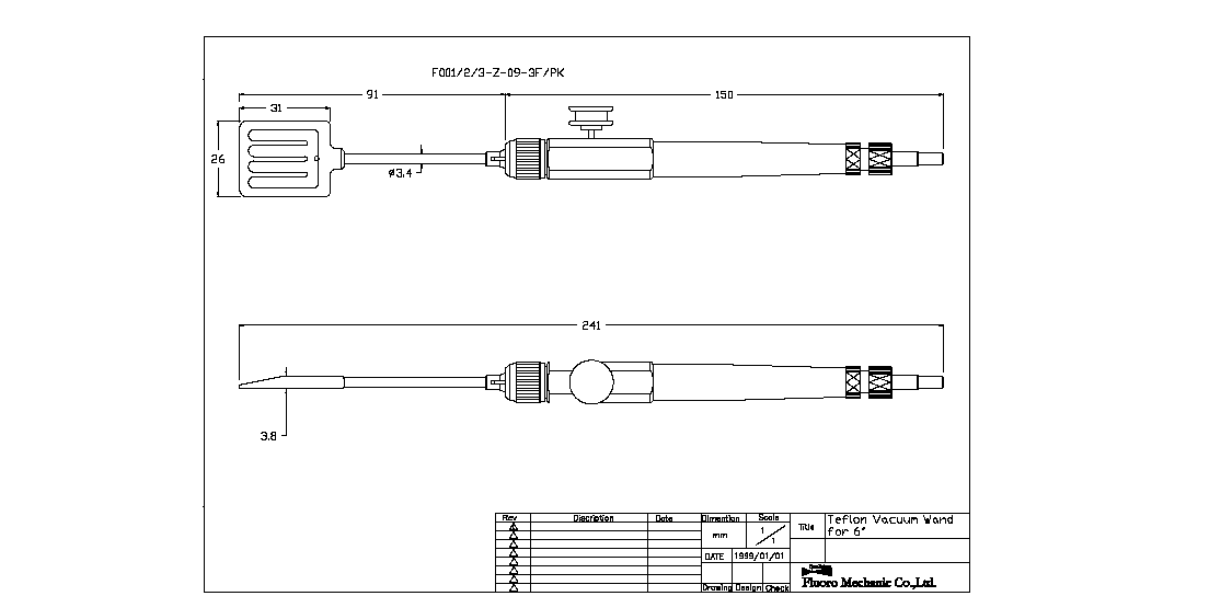 Complete vacuum wand including tip for wafer handling. PTFE body. Normally open push-button valve (press to release the wafer). Vacuum is automatically switched off when placed in stand 658 or 659. The tip can be rotated and locked in position. With PEEK tip. Wand body and tip available separately. The vacuum tube connector allows push-on connection to any flexible tubing from 2.5 mm to 4 mm ID. The tube connector has a quick connection feature that allows wands to be interchanged rapidly.